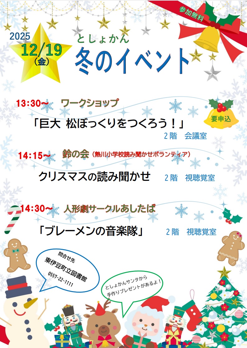 また、熱川小学校読み聞かせボランティア鈴の会によるクリスマスの読み聞かせや、人形劇サークルあしたばさんの人形劇も行います。