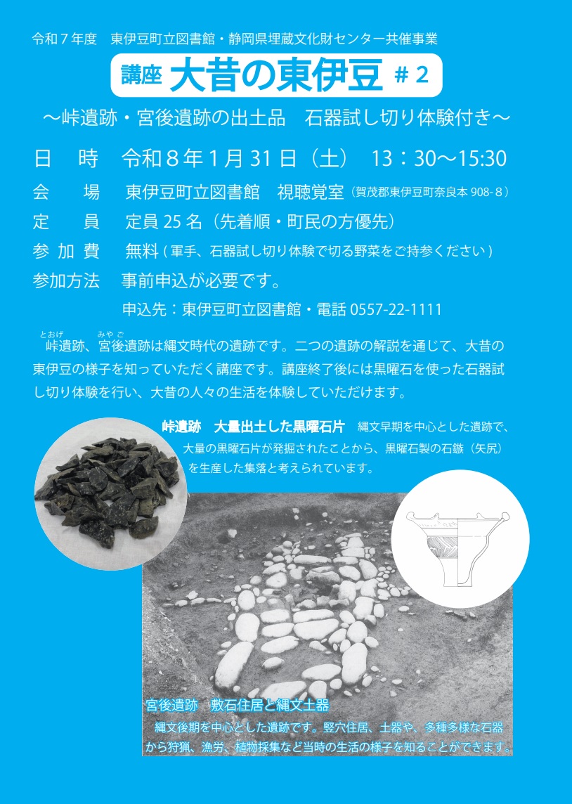 当館では、『講座 大昔の東伊豆#2 ~峠遺跡・宮後遺跡の出土品 石器試し切り体験付き~』を開催します。